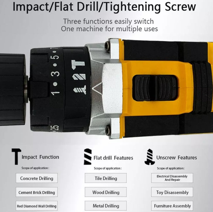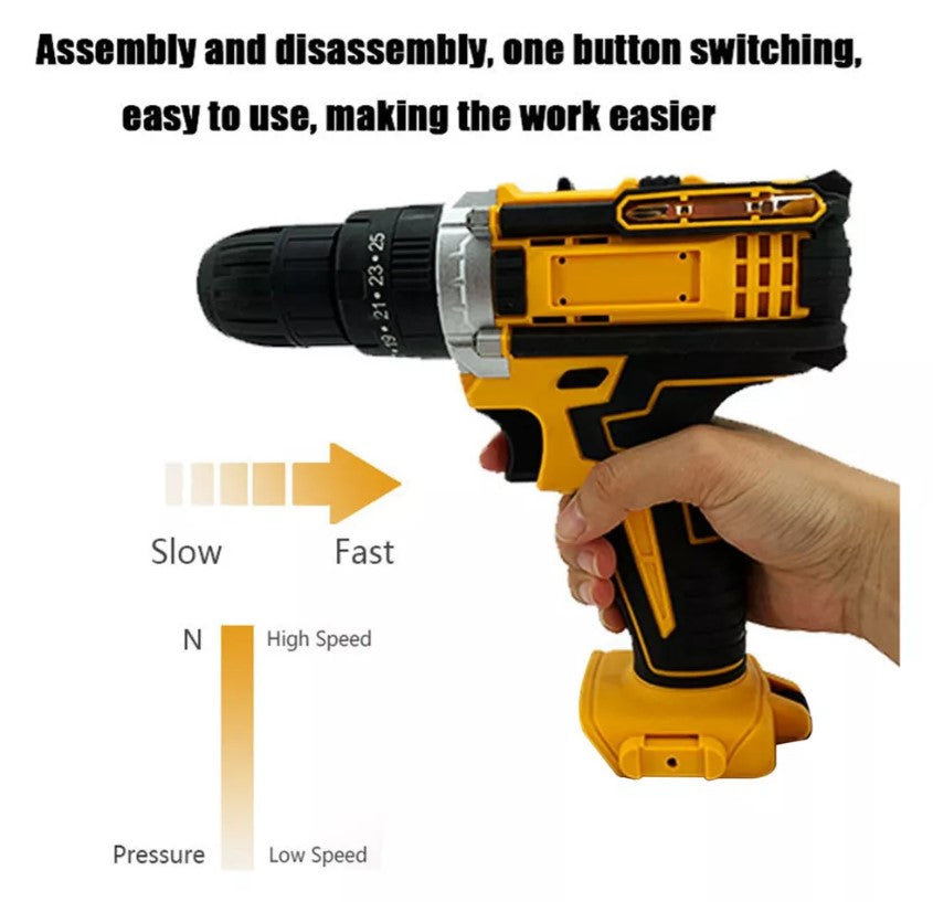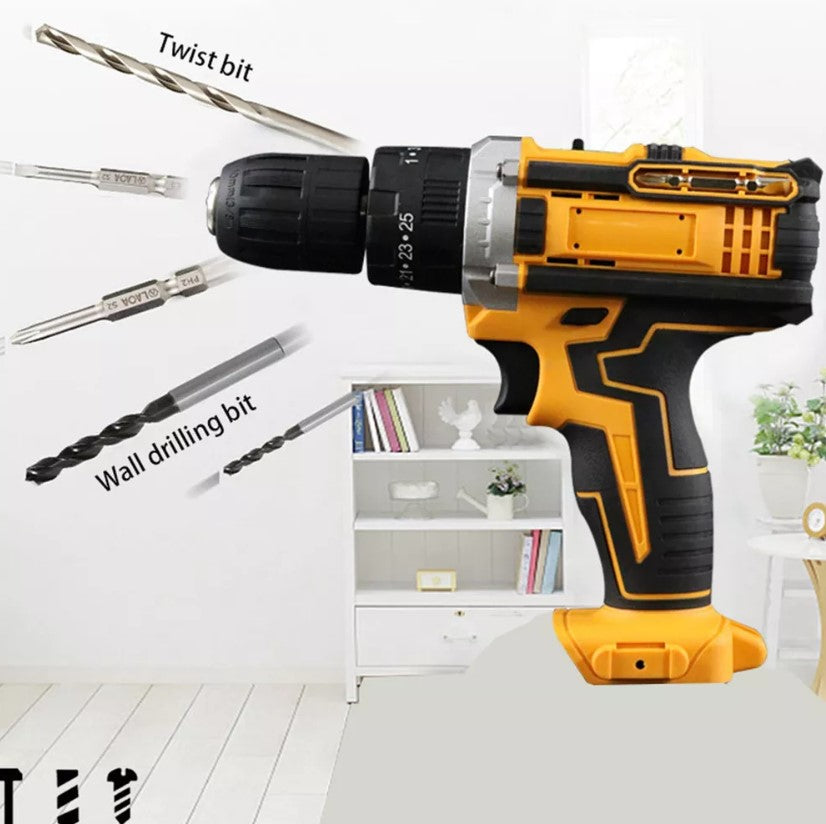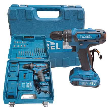 Un taladro para un profesional y un aficionado al trabajo.Este taladro inalámbrico ofrece varios beneficios para ti, para el que quiere tener un excelente aliado para tareas diarias de construcción, armado de muebles y más. Gracias a su batería y liviano peso es ideal portarlo en todo momento, esto hace que sean ideales para trabajos al aire libre, construcción de jardines, colocación de faroles, etc.Características:Perfora, atornilla y más. Arma todo lo que siempre deseaste de forma rápida y segura.Lleva a todos lados tu atornillador, cuenta con batería por lo que hacer inalámbrico podrás trabajar en todas partes de tu casa, al aire libre, y más.Especificaciones:Marca: Tasbel - Color Azul y Amarillo AleatorioModelo: Taladro inalámbrico Potencia: 98V2 x Batería recargableMax par: 35NVoltaje: 220VSet Broca MaderaSet Broca LadrilloSet Broca Cerámica